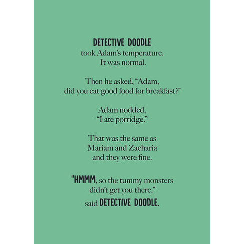 Adam didn’t like tummy monsters. But they were back! They made Adam feel ill. Adam’s Dad transforms into Detective Doodle to try to find out where they came from. What does he find? Will Adam feel better again?