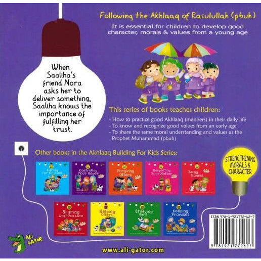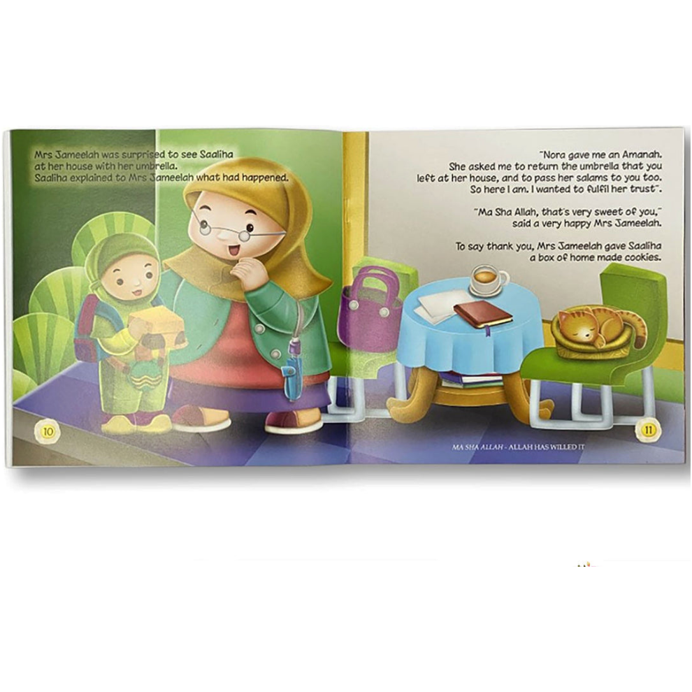 In this brand new title, children learn all about carrying out any Amanah (responsibility / trust) given to them. When Saaliha's friend Nora asks her to deliver something, Saaliha knows the importance of fulfilling her trust.