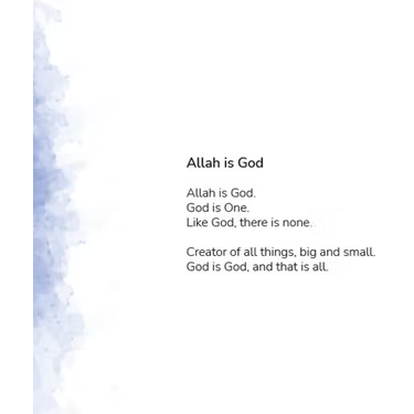 A selection of poems written over a few years by a mother to her son, in response to the many questions and conversations they had about Allah's Existence, Presence, Knowledge and so much more. A beautiful gift for any child starting their journey of discovering God (Allah).