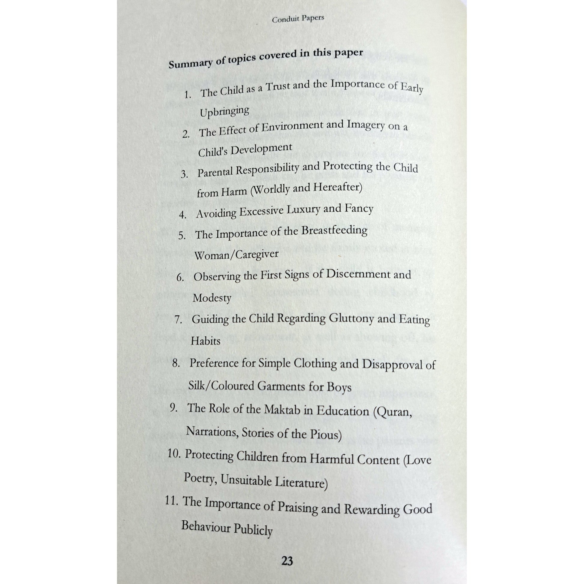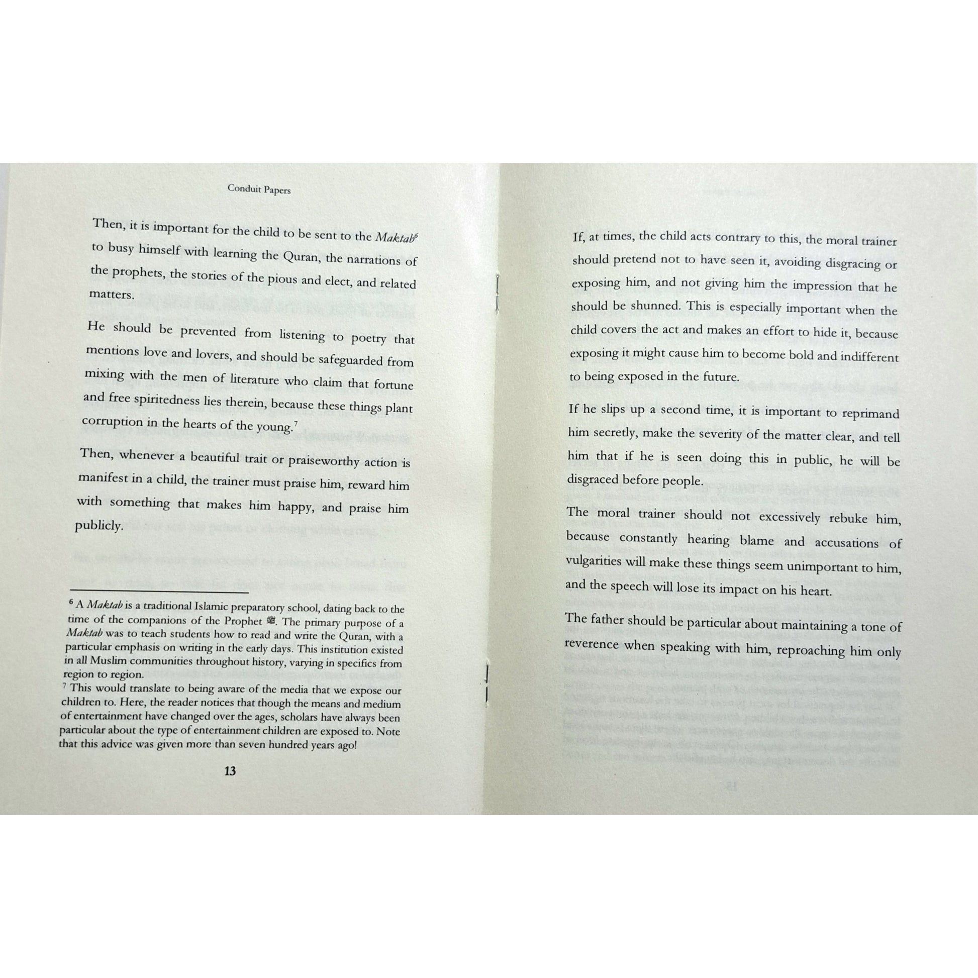 This book is an extract from 'Al-Madkhal' by Ibn al-Haj Al-Abdari, a renowned Moroccan Maliki scholar. The book focusses on guiding children through tarbiya. It provides practical advice on daily interactions, behaviour and habits, making it valuable for parents and teachers to implement and discover its wisdom and benefits.