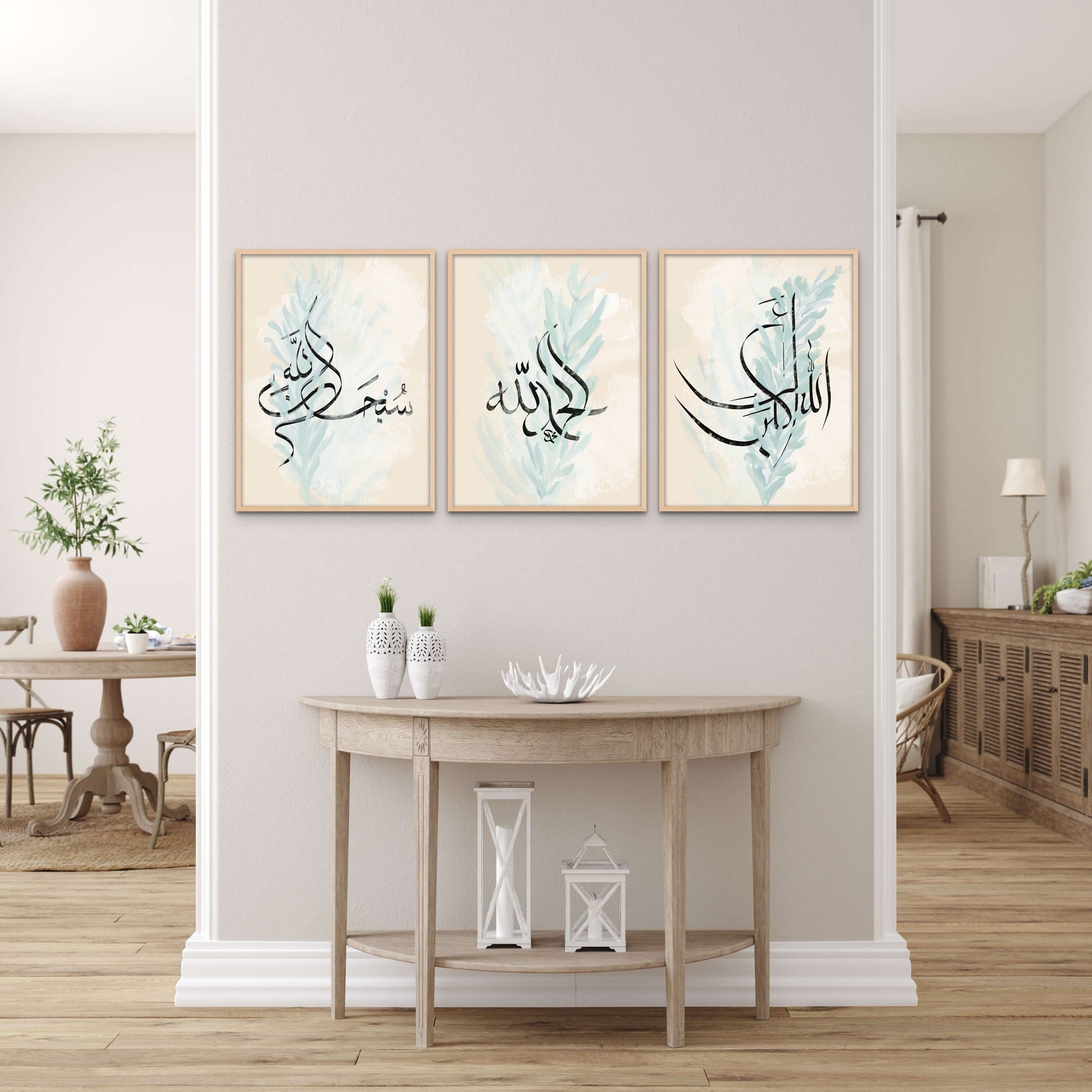 A contemporary, minimalist tribute to the understated elegance of neutral design elements, the "Silky Stem" collection features sage & duck egg coloured leaves intertwined with unique, original calligraphy of Subhannalah, Alhamdullilah & AllahuAkbar.