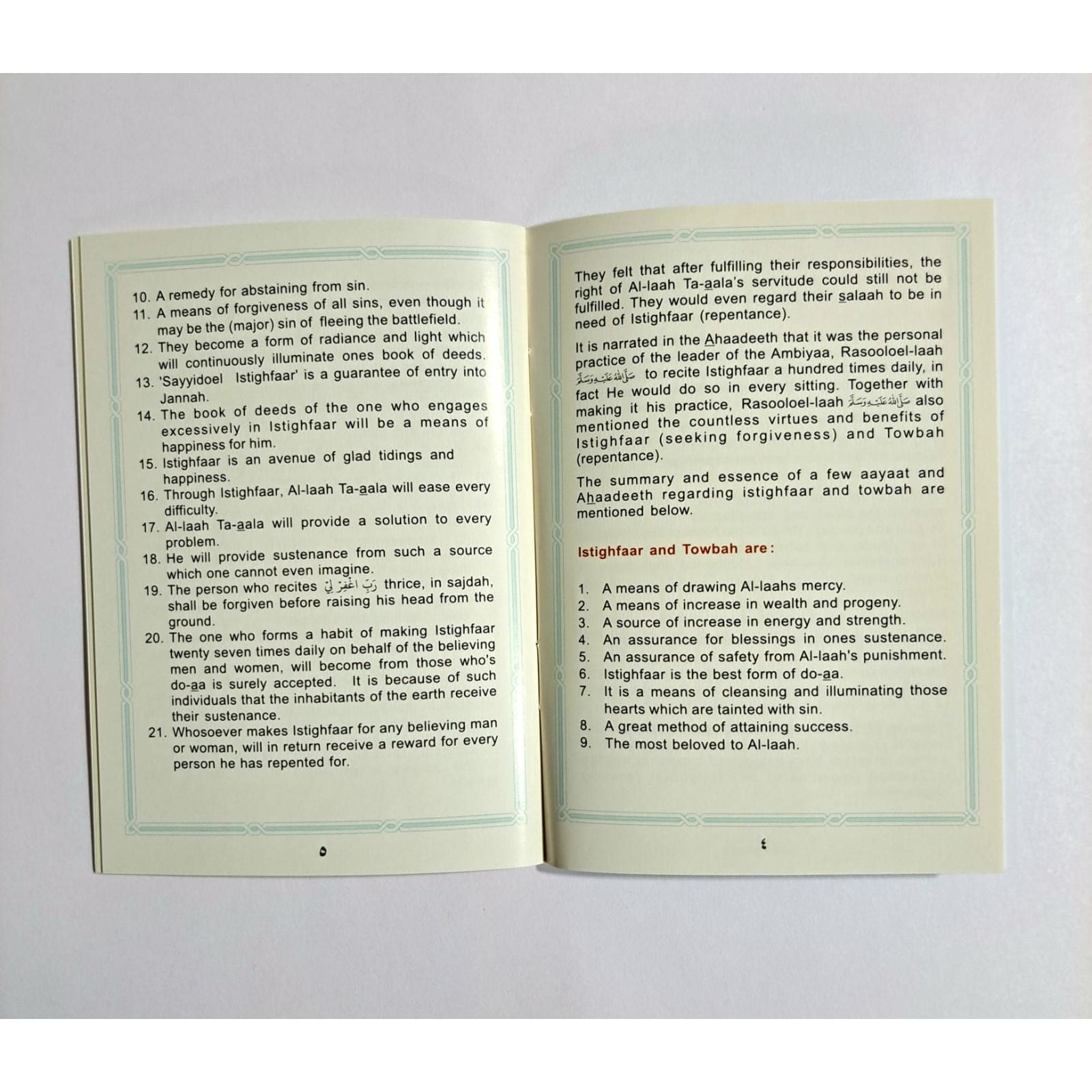 The book compiles of forty ahaadeeth that focus on the Islamic concepts of Istighfaar (seeking forgiveness from Allah) and Towbah (repentance to Allah).