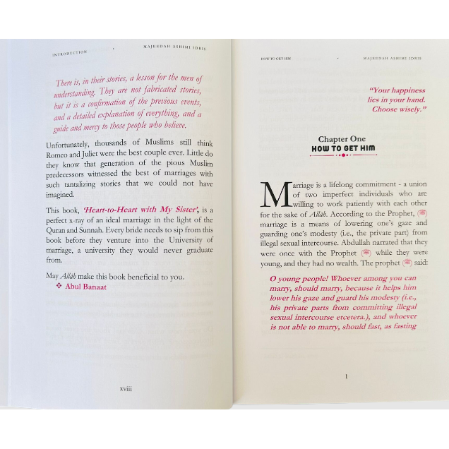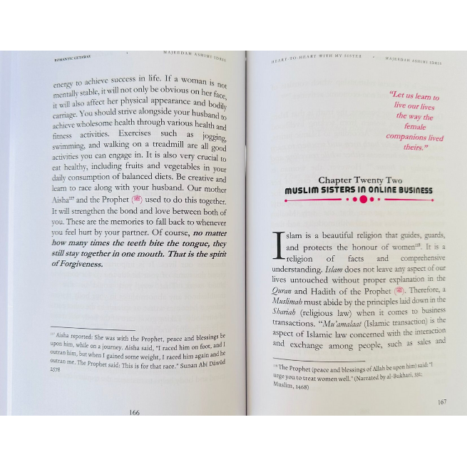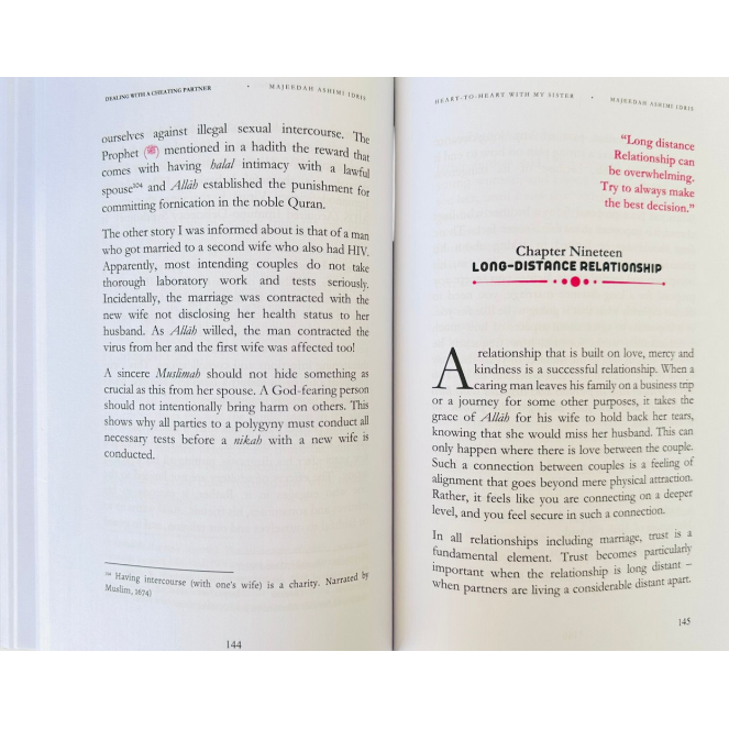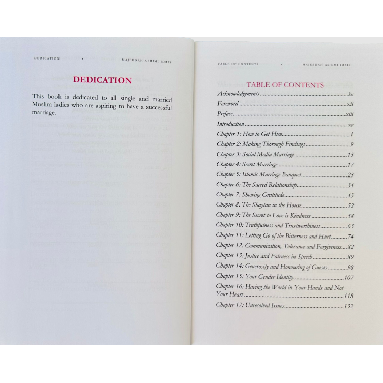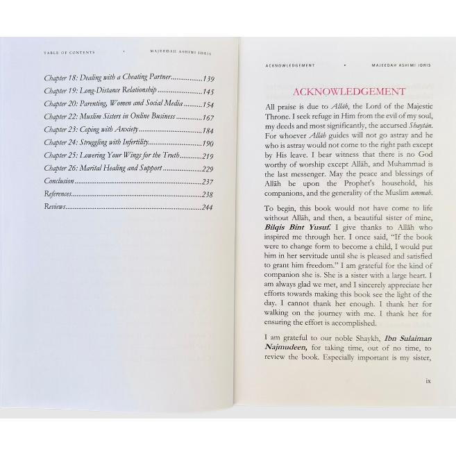 The author relates lessons to be learnt from true life events and solutions on vast topics ranging from seeking a spouse, the dignity of the woman, keeping the marriage bond, living apart, divorce, coping with infertility, coping with stress and anxiety, seeking halāl means of livelihood and socialising with other Muslim sisters physically and virtually.