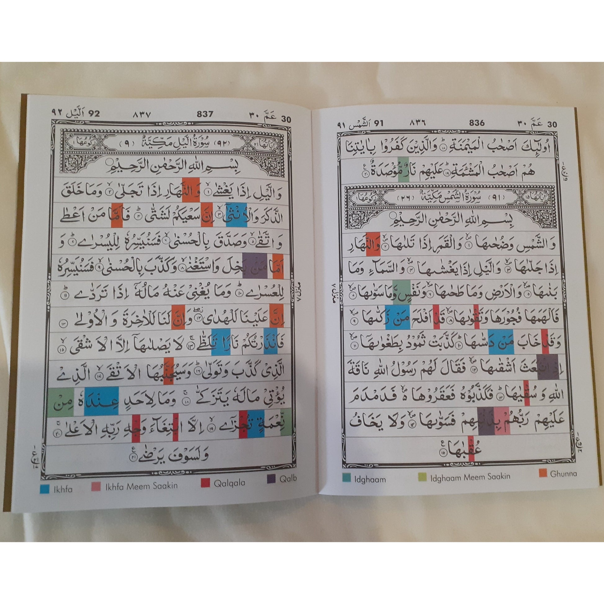 A box set of 30 individual juz / chapters of the Quran, to facilitate easy reading of the Quran with tajweed. Seven different shades of the colour spectrum are used and each colour represents a tajweed rule. Having a colour block on the tajweed rule allows the reciter to emphasise the accent, phonetics, rhythm and tempo of the Quranic recitation.