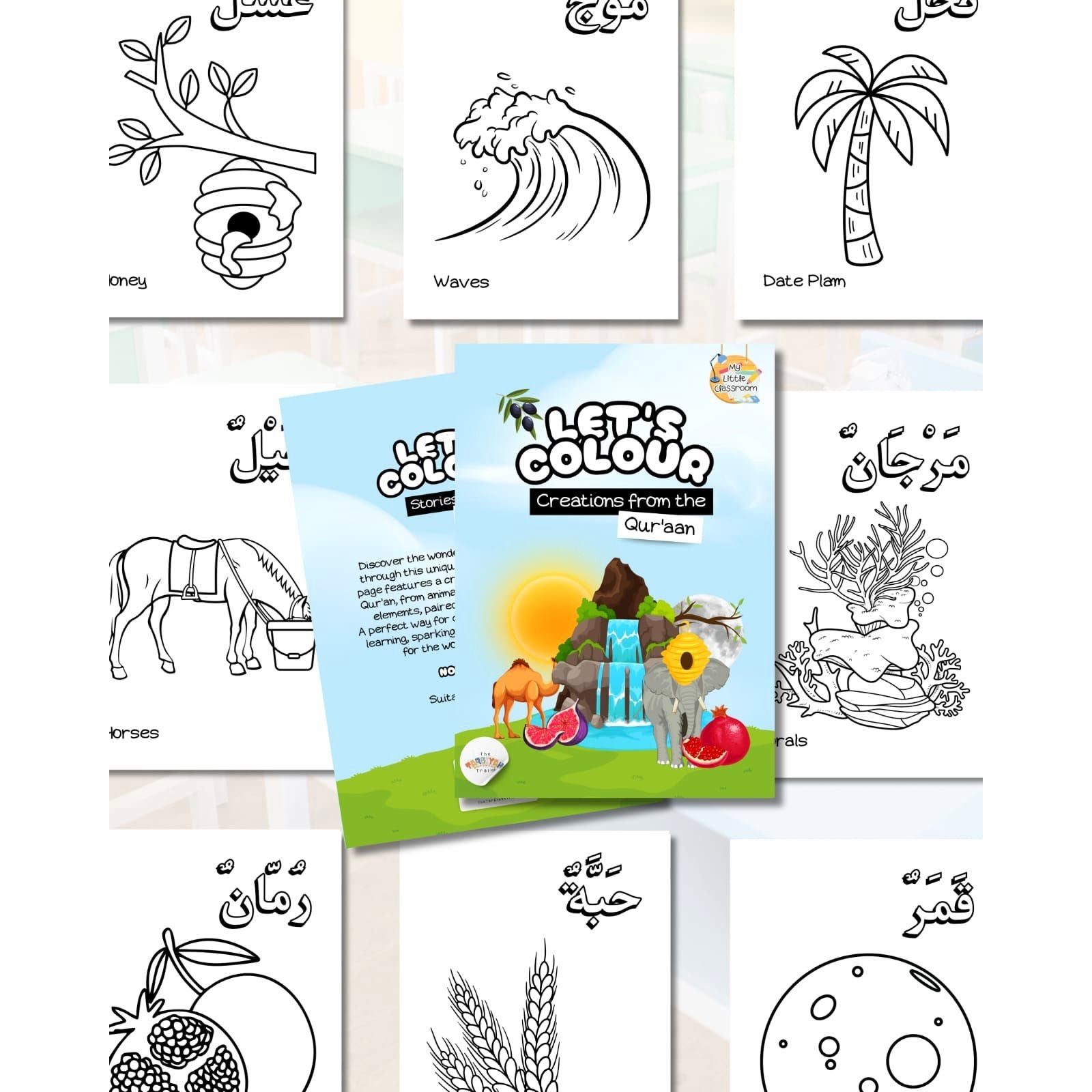 Introduce little ones to the awe-inspiring creations of Allah with this delightful colouring book designed especially for young hearts and hands. Each of the 28 pages showcases a non-living creation mentioned in the Qur’an like plants, elements, and natural wonders, beautifully paired with its name in Arabic.