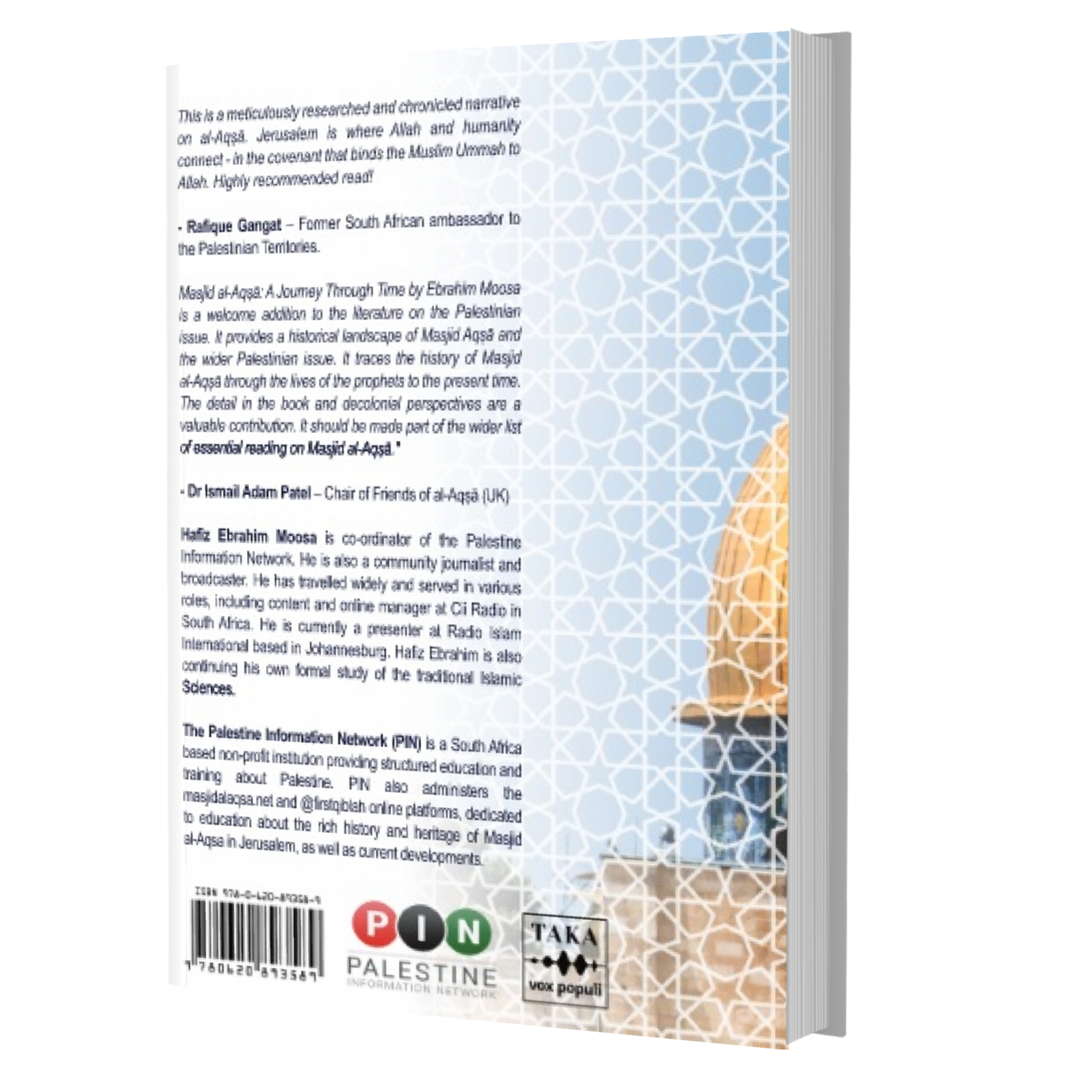 'Masjid al-Aqṣā: A Journey Through Time by Ebrahim Moosa is a welcome addition to the literature on the Palestinian issue. It provides with a historical landscape of Masjid Aqṣā and the wider Palestinian issue. It traces the history Masjid al-Aqṣā through the lives of the prophets to the present time. The detail in the book and decolonial perspectives should provide valuable contribution. It should be made part of the wider reading on Masjid al-Aqṣā.' - Ismail Adam Patel – Chair of Friends of al-Aqsa (UK) and author of a number of books on Palestine.