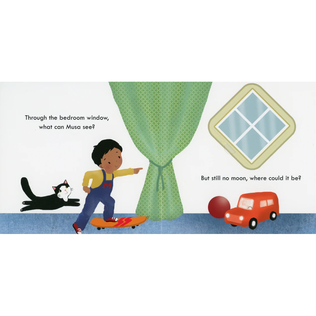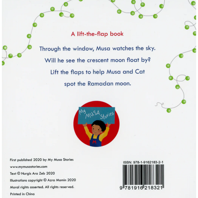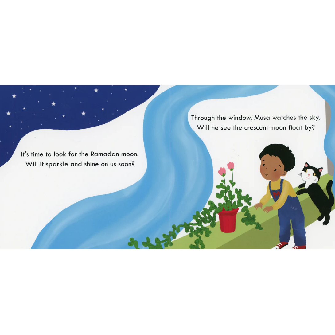 Through the window, Musa watches the sky. Will he see the crescent moon float by? Lift the flaps to help Musa and Cat spot the Ramadan moon.