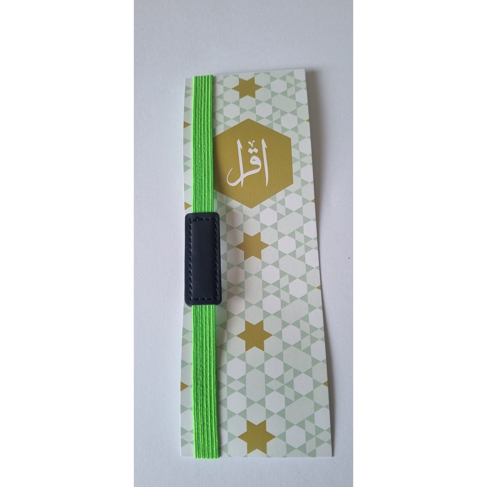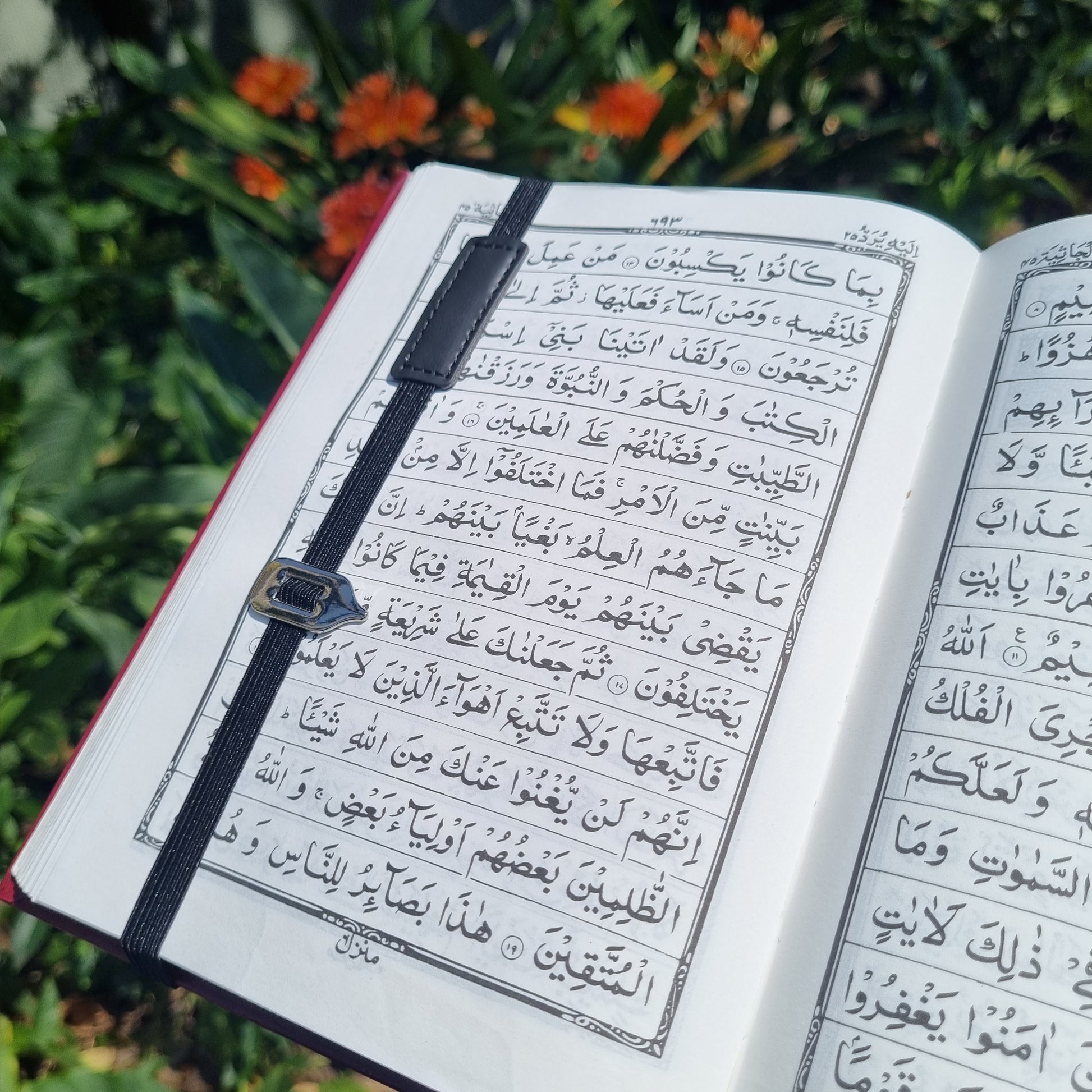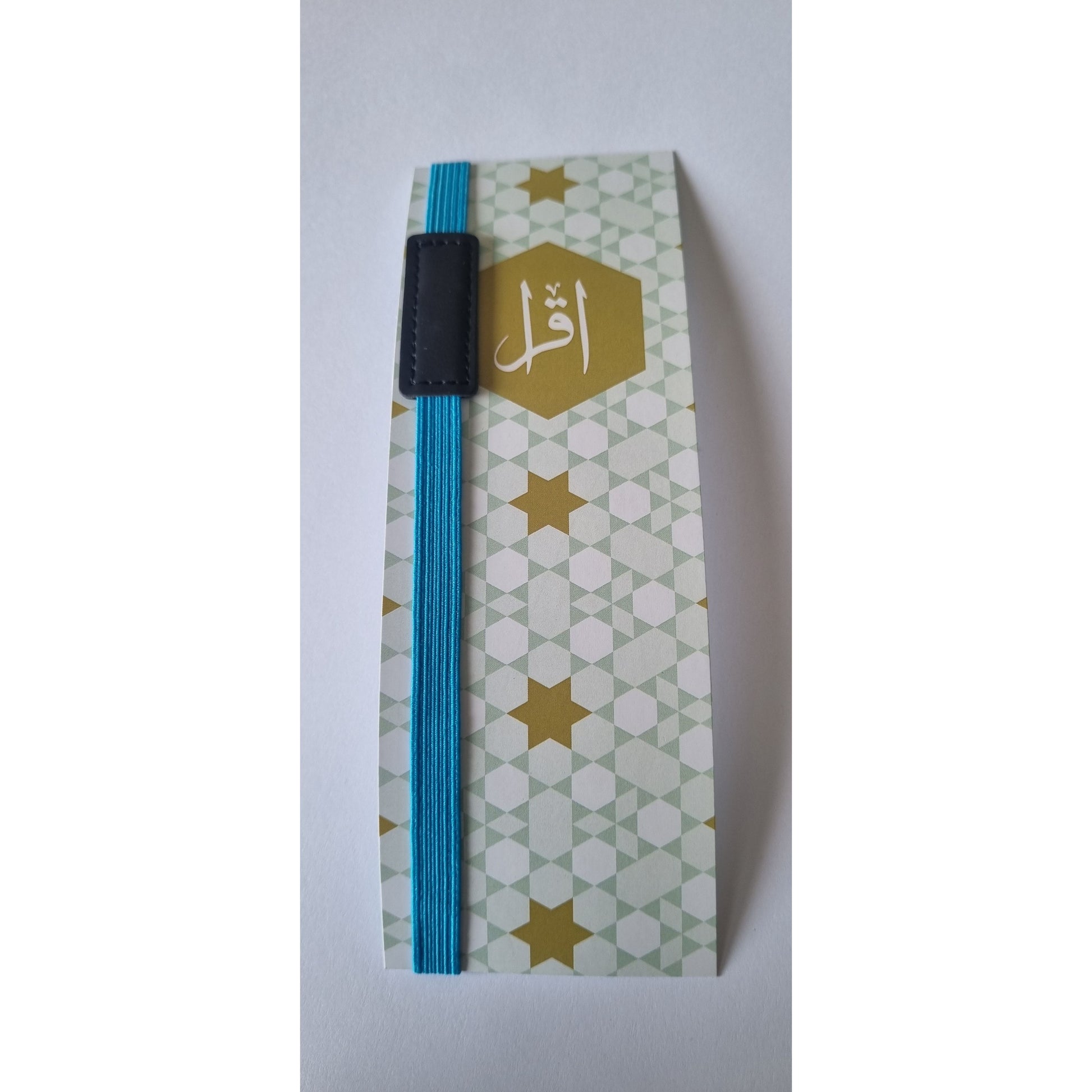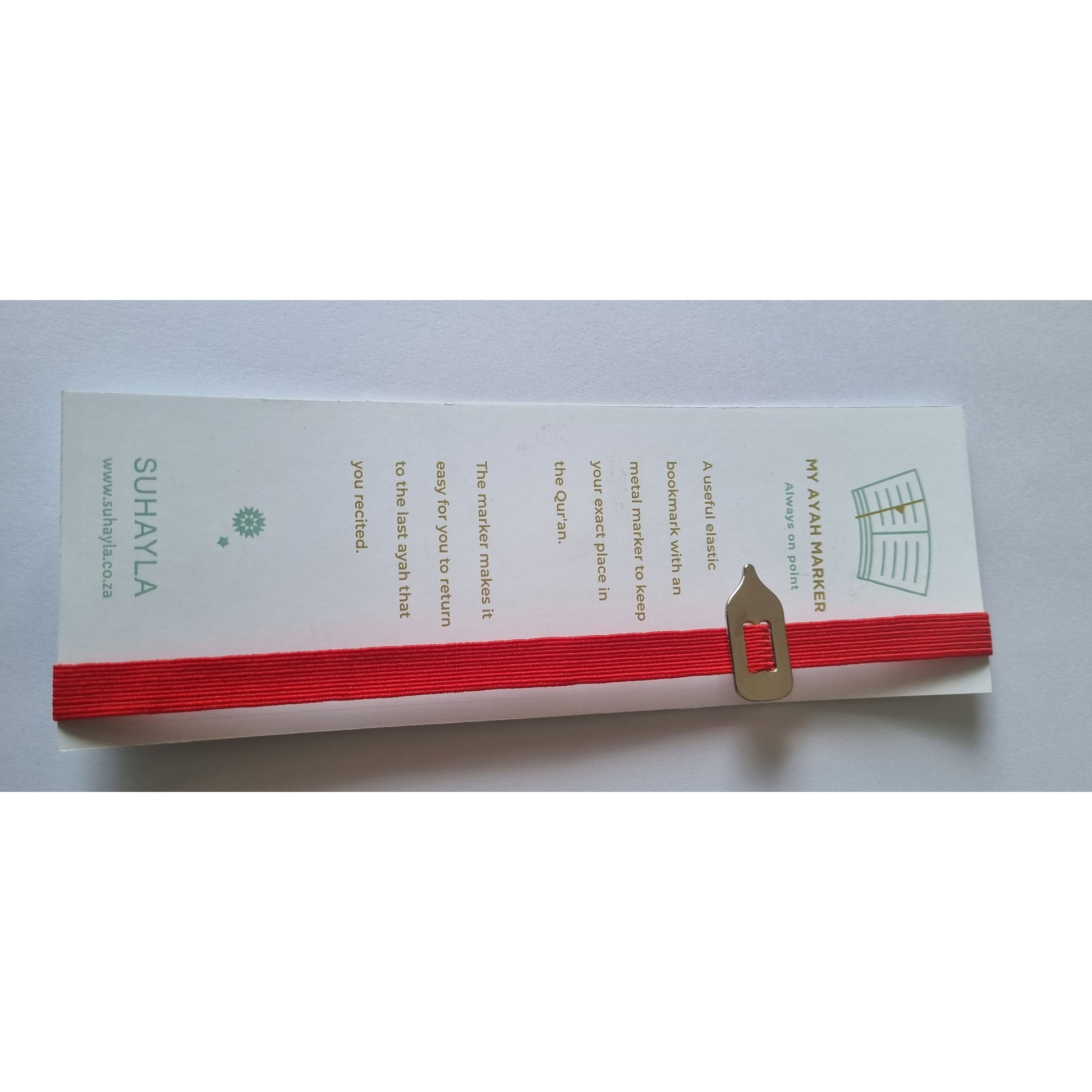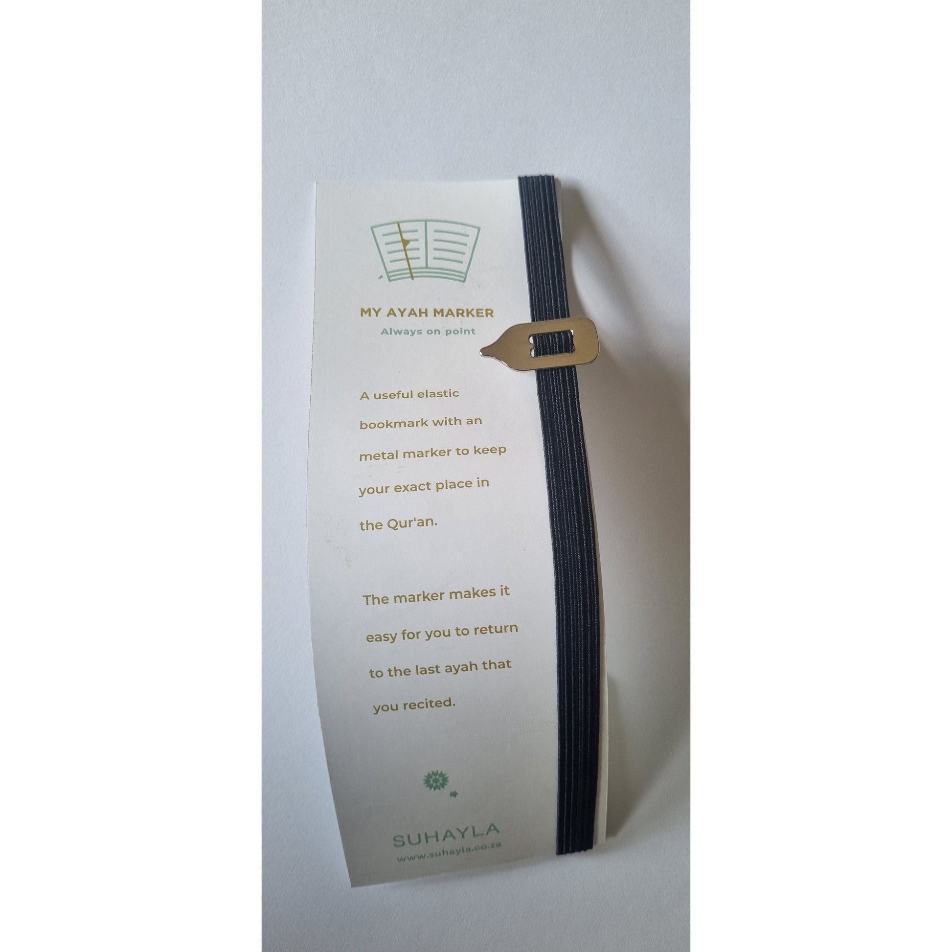 A useful elastic bookmark with a metal marker to keep your exact place in the Quran.