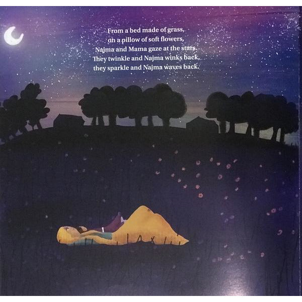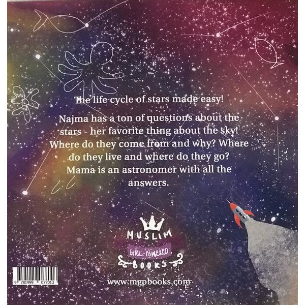 Najma loves stars. She wants to swim with them in the ocean-like sky and paint them in all their different shades and sizes. Mama, an astronomer, sets up her telescope and walks Najma through the life-cycle of stars; how they're born in clouds of gas and dust called Nebulae and how they end up as stardust that helps the universe grow. They talk about Allah as the Creator of the stars and thank Him for everything they love. Full of curiosity and wonder, Najma is written in simple yet whimsical prose.