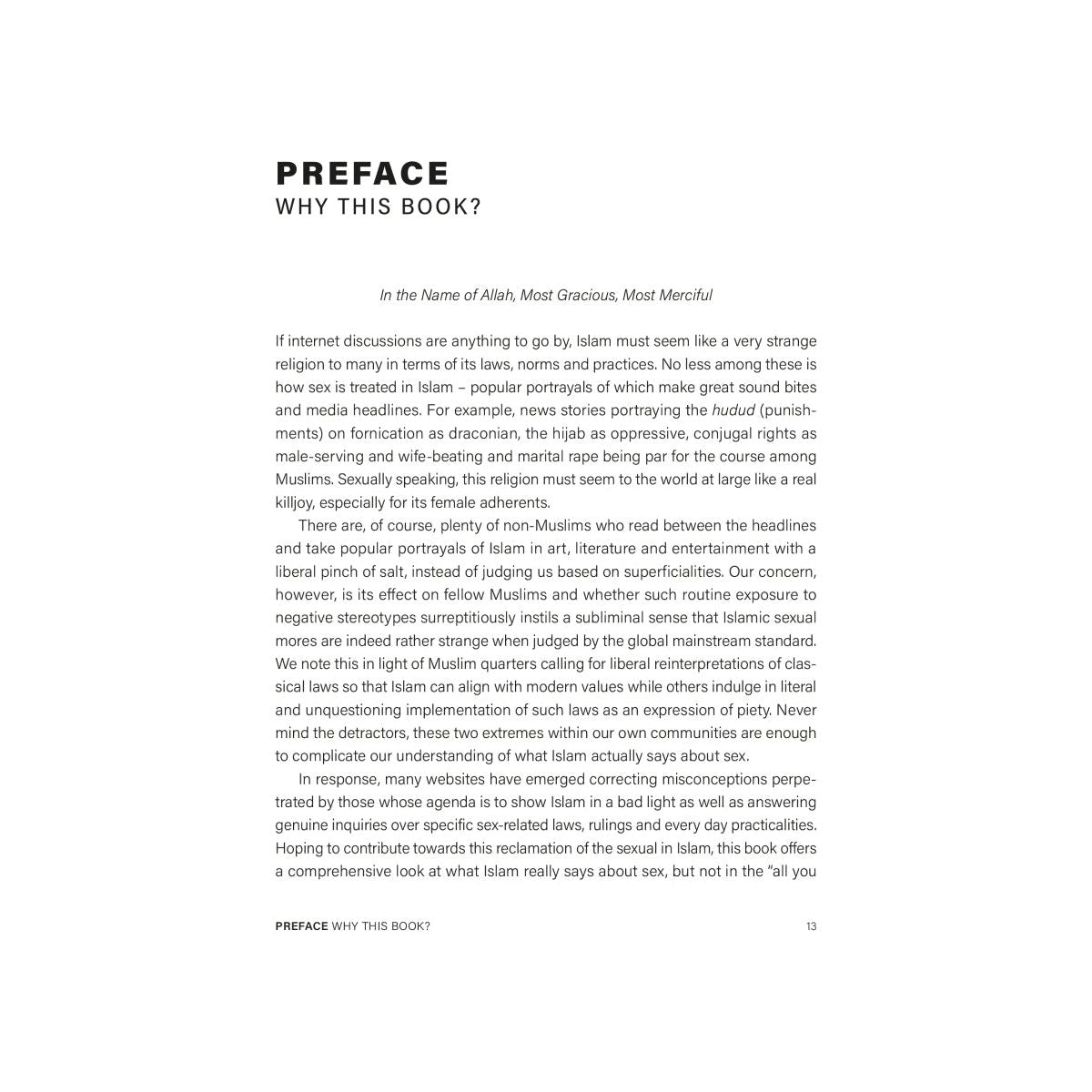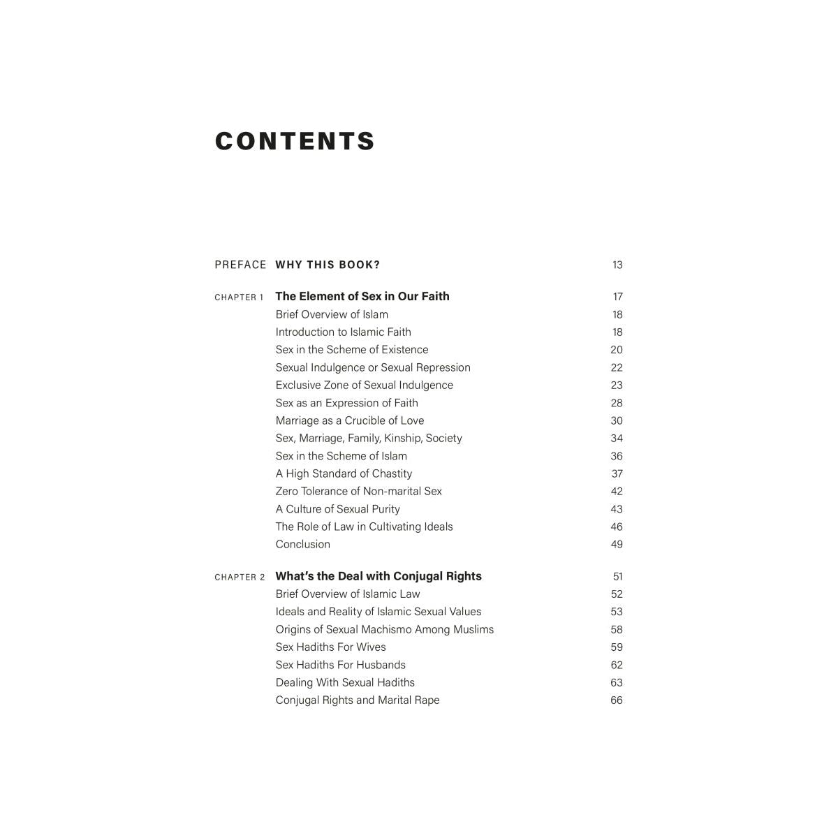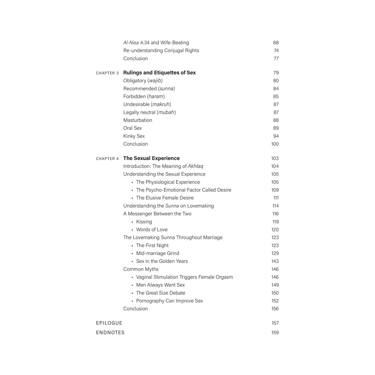 Along the way, it explains how marriage anchors this alliance, reframes a prevalently male-serving view of conjugal rights and reintroduces sensual pleasuring as the underlying theme behind the Islamic outlook on lovemaking.