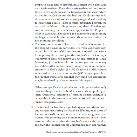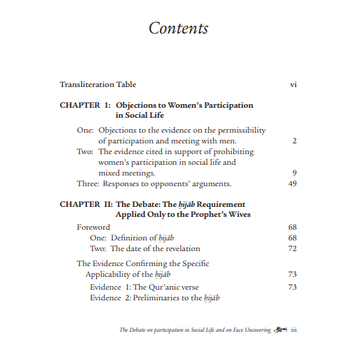 In this volume of his work, the author starts a debate taking two full volumes to answer the objections that are often raised concerning social mixing and keeping a woman's face uncovered in Muslim society. This is a tradition in Islamic studies, when scholars present their views in opposition to other scholarly views. They state the view they disagree with, showing its basis and the arguments that are stated in its support before responding to it. The author gives an in-depth study showing that the rulings that were specific to the Prophet's wives are not addressed to other women. Therefore, emulating the Prophet's wives in these particular aspects is neither required nor recommended. This Eight volume series is the author’s abridged version of his longer work with the same Arabic title, Tahrir al-Mar’ah fi ‘Asr al-Risalah spanning a twenty-five year study comprising fourteen great anthologies of ahadith, but in this book he only rarely includes hadiths from any anthology other than the two most authentic ones of al-Bukhari and Muslim.