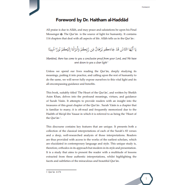 The Heart of the Qur'an is a collection of loving letters sent from God to humanity. The Prophet Noah would plead with his people, saying “I am delivering my Lord’s messages to you” [Qur'an 7:62]. With the current paradoxical climate of increasing secularization and the rise of fundamentalism across the world, there is no better time to search for fresh insight and guidance from the Qur'an. The Heart of The Qur'an is a well-researched commentary on Surah Yasin. It is written in simple English and is complete with diagrams and illustrations to create an engaging read. The commentary is profound and inspiring, it masterfully highlights the nuances of the Qur'ān’s language and repeatedly draws the reader’s attention towards practical changes they can make in their lives.