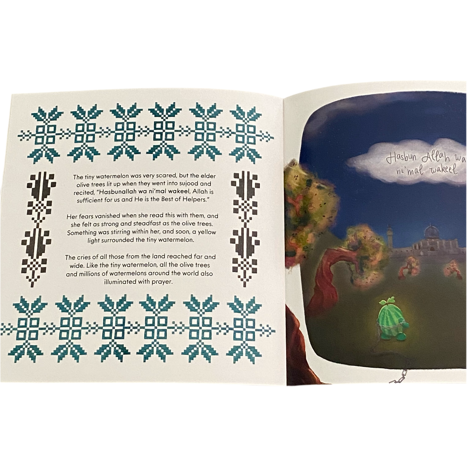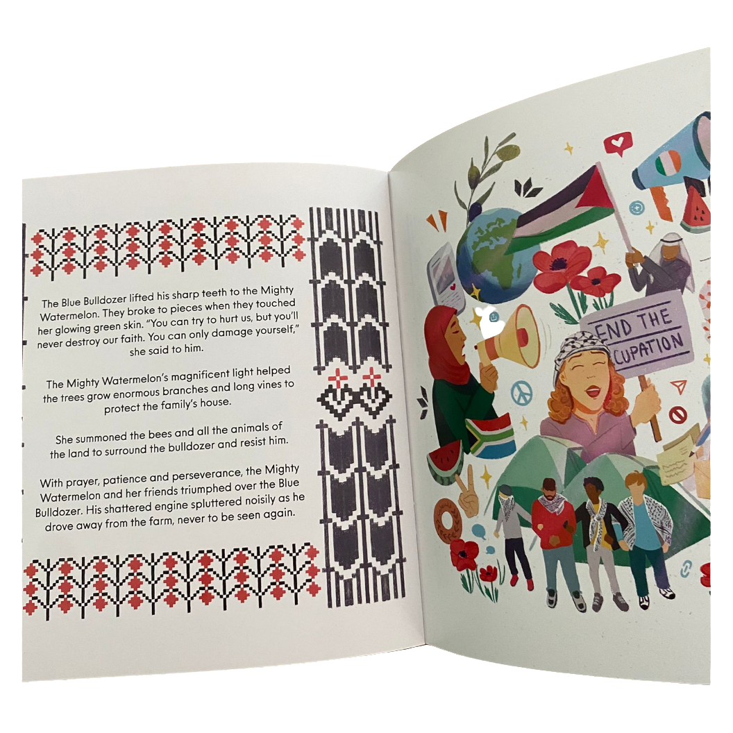 A children’s book about a beautiful blessed land, Palestine, a tiny watermelon and her friends who live on the farm. One day they find their land in danger and they have to defend themselves against the blue bulldozer.